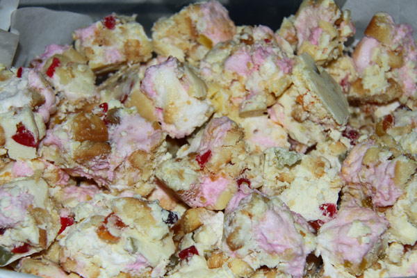*If making this Rocky Road for someone with a nut allergy or intolerance, substitute the nuts with another 100g of Scotch finger or shortbread biscuits. Ensure the biscuits are free of nut contamination, even if they don’t actually contain nuts. Some brands of biscuits are manufactured using the same equipment as products containing nuts, and the very slight traces of nut residue can make a nut-allergic or nut-intolerant person quite ill.